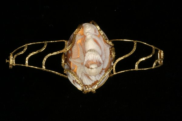 Within you is the infinite, boundless beauty of the sea! The Sea Life cuff bracelet is a one of a kind, hand carved cameo shell amulet. The centerpiece of this exqusite bracelet, it is magnificently detailed and complimented by a modern 18K gold setting. A masterpiece of art carved by Italian masters, this beautiful sculptural ornament is the crowning glory to your ensemble day or night.