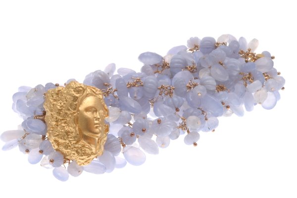 Your beauty brings richness, wealth and pleasure! Ceres Golden Goddess of Abundance clasp, is the centerpiece of this Chalcedony jeweled cuff bracelet. Intricately designed, this exquiste bracelet is created from over 400 faceted stones! Day or night a perfect finish to your ensemble, this sculptural ornament is a true work of art. Originally carved by Italian masters, the goddess is cast in precious metal and layered in 18K gold! Also available in Platinum and Silver finishes.